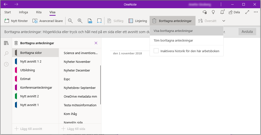 För att hitta dina borttagna anteckningar börjar du med att öppna rätt anteckningsbok. Sedan går du till fliken Visa och väljer Borttagna anteckningar.