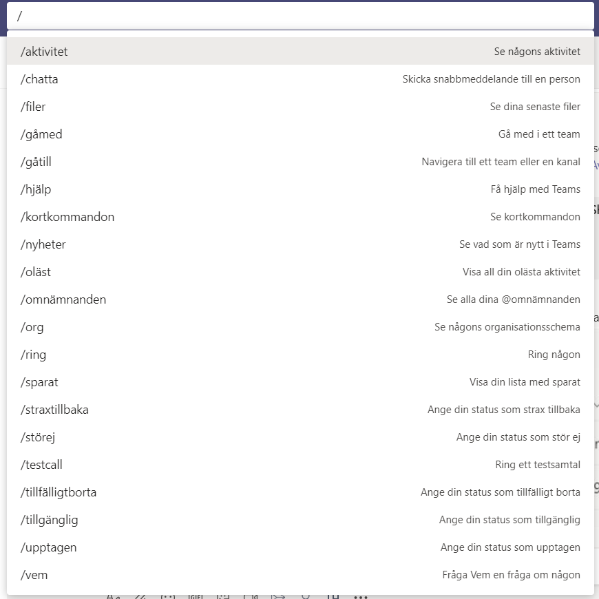 Prova att skriva / så får du fram en lista med funktioner, några relaterade till sökning och andra relaterade till olika åtgärder i Microsoft Teams. De jag tycker är mest användbara är: