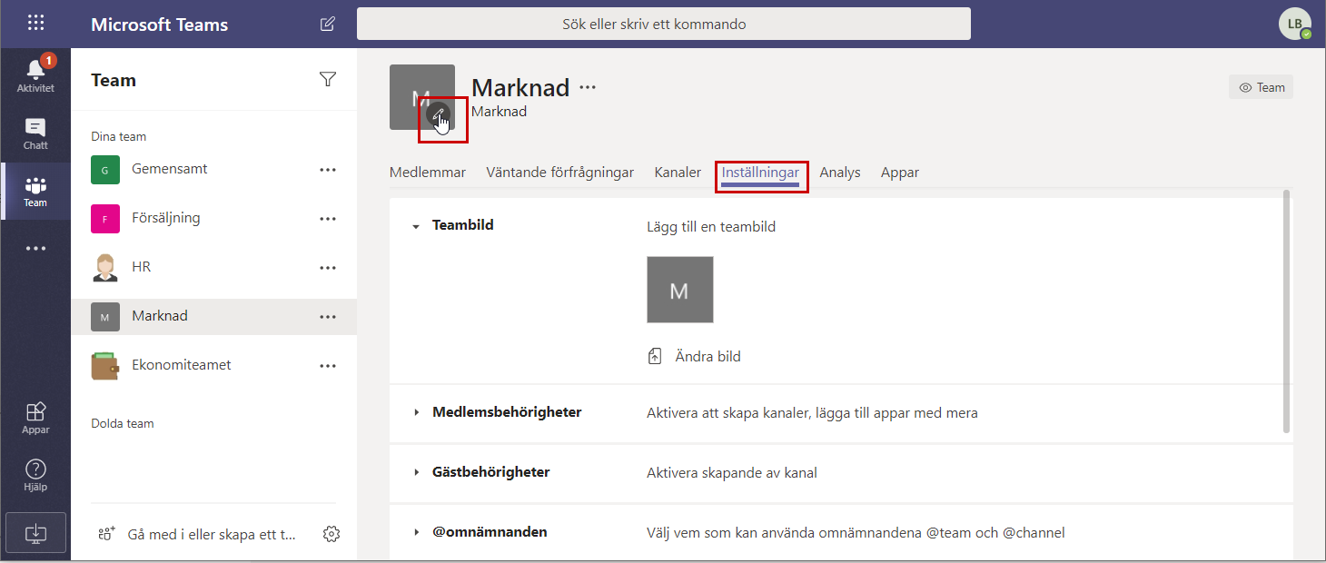 Du måste vara ägare till Teamet för att komma åt fliken inställningar (hantera Team) så att du kan ändra bild. Välj Ändra bild och ladda upp en ny bild. Det går att byta bildgenom att ladda upp en ny eller ta bort bilden helt och återgå till standardikonen.