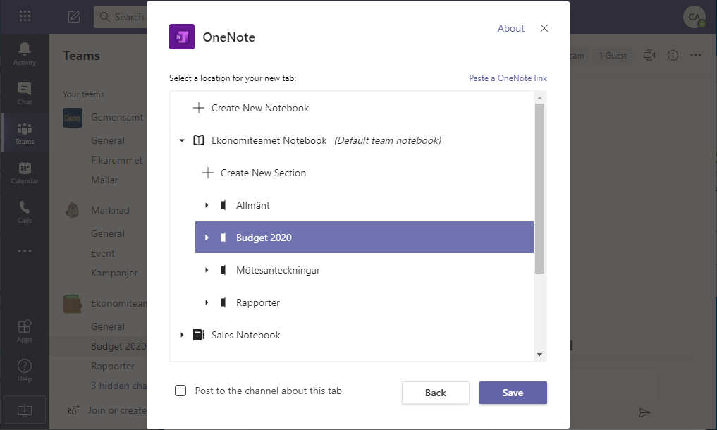 Du kan även skapa flikar i de olika kanalerna och koppla till olika avsnitt i anteckningsboken, ett avsnitt per kanal, så blir det enkelt att strukturera och hitta rätt bland anteckningarna.