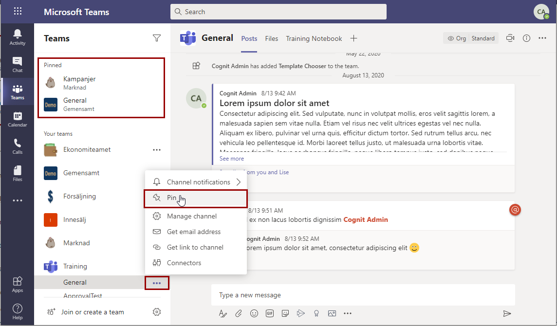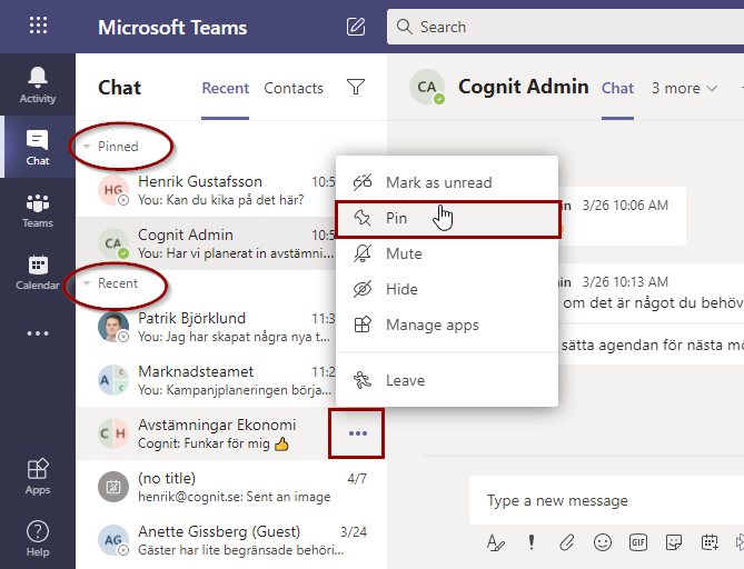 Du kan också favoritmarkera - Fästa - de kanaler du är mest aktiv i. Fästa kanaler läggs överst i listan så att du alltid har dem lätt tillgängliga och det går ändra ordningen på de fästa objekten så att du får dem som du vill ha dem. Du tar bort dem från Fäst-listan genom att välja Plocka bort.