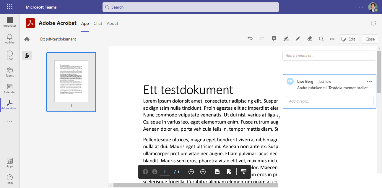 Pdf-dokumenten öppnas med Adobe Acrobat och ni kan kommentera i pdf-filen direkt i Teams