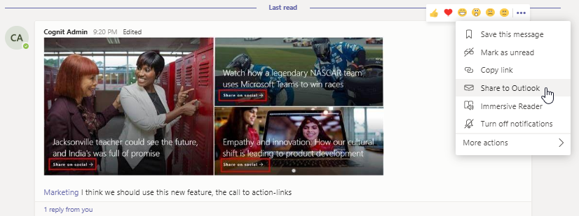 I dessa situationer kan du använda en ny funktion i Teams: Dela till Outlook. Skicka konversationen som epost - så behöver inte alla leta.