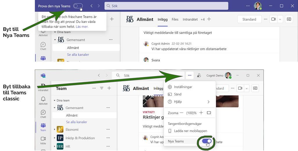 Har du provat Nya Teams än? Det finns en funktion som gör att du kan växla mellan Nya Teams och classic Teams direkt från ditt Teams-gränssnitt. Detta innebär att du kan testa de nya funktionerna i din egen takt och återgå till Classic-versionen om du behöver det - åtminstone fram till 31 mars 2024 då Teams kommer uppgraderas automatiskt för alla.
