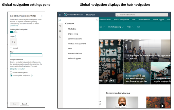 Aktivera global navigation och välj vilken navigation som ska användas. Bildkälla: Microsoft