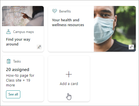 Instrumentpanelen används som startsida för Viva Connections i mobilen och kan även användas i SharePoint med hjälp av den nya webbdelen Instrumentpanel.