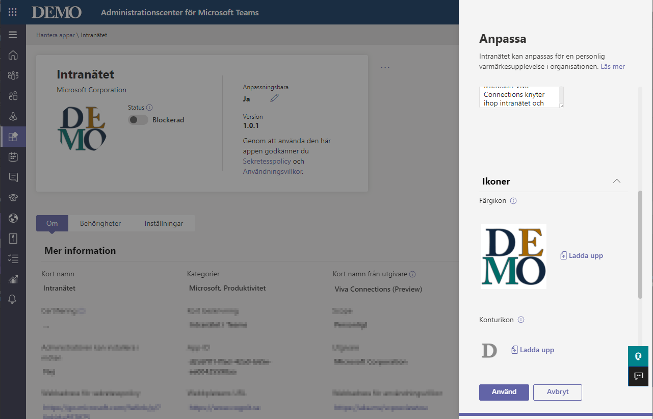 Gör anpassningar till din Viva Connections-app - välj ett namn och ladda upp egna loggor etc