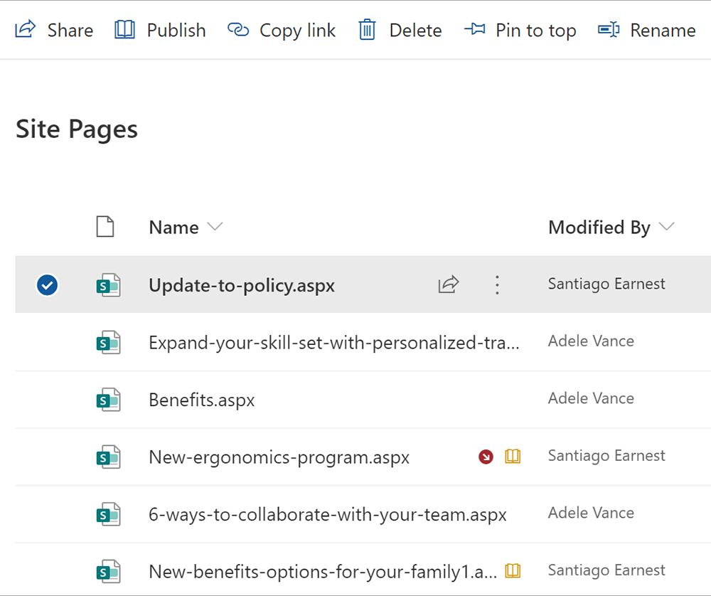 SharePoints sidbibliotek får en ny knapp - Publicera - och nya ikoner för att visa vilka sidor som har opublicerade ändringar.