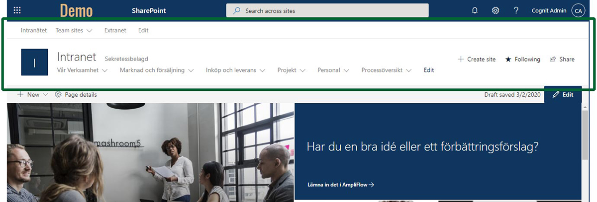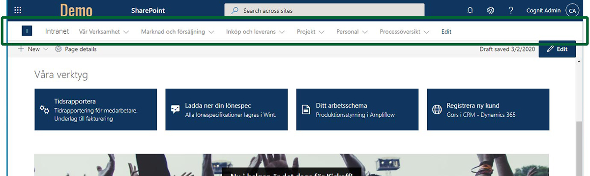 Headern i SharePoint som den ser ut “från början”
