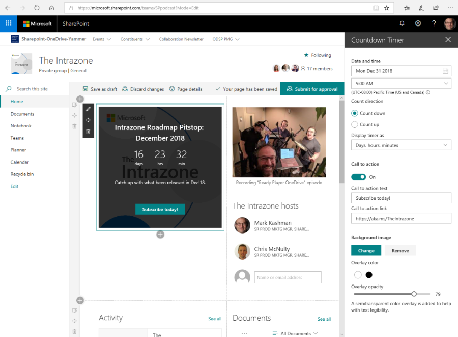 Har du något stort på gång, ett datum som är viktigt för alla i organisationen? Snart kommer webbdelen Nedräkning. Med den kan du visa nedräkning till viktiga startdatum, möten, kampanjmål, etc på ditt intranät.