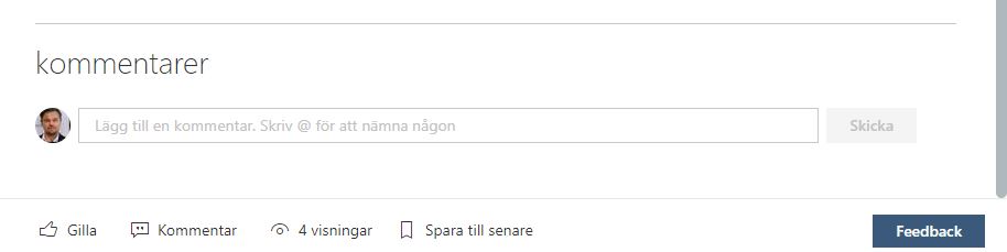 På liknande sätt kan du också tagga kollegor om du vill uppmärksamma dem på en särskild nyhet i SharePoint. Skriv @ och namnet i kommentaren så får nämnd kollega ett mail med länk till nyheten och kan läsa och besvara din kommentar.