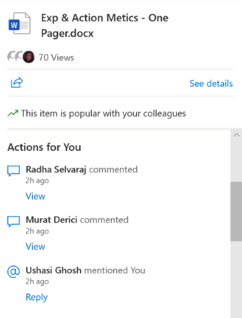 Nu visas viktiga filaktiviteter i förhandsvisningen i SharePoint, den som visas när du hovrar över en fil. Informationen som visas där kan gälla till exempel vem som arbetar med filen, om någon har kommenterat något eller kanske @omnämnt dig. Det finns också en länk som tar dig direkt till kommentaren eller omnämnandet.