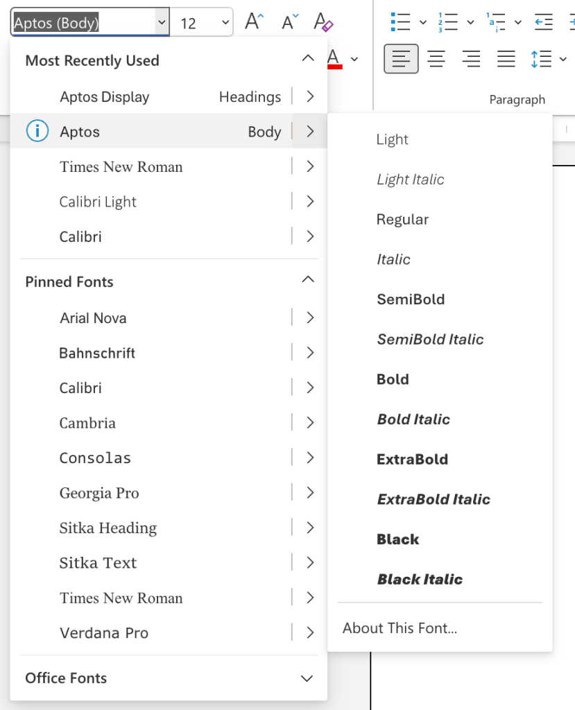 Typsnittet Aptos röstades fram som favorit bland fem förslag och ersätter nu Calibri som standardtypsnitt i Office. Aptos finns i en mängd vikter och varianter, från fet och kursiv till narrow, serif och monospace - för att passa i alla sammanhang.
