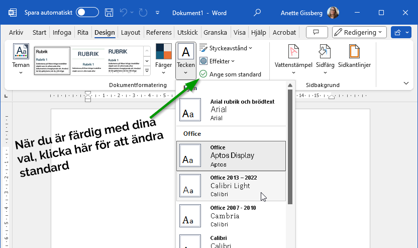 Du kan också välja att skapa ett helt eget tema med egna standardtypsnitt, färger och textformatering. Om du väljer “Ange som standard” kommer inställningarna gälla för nya dokument.