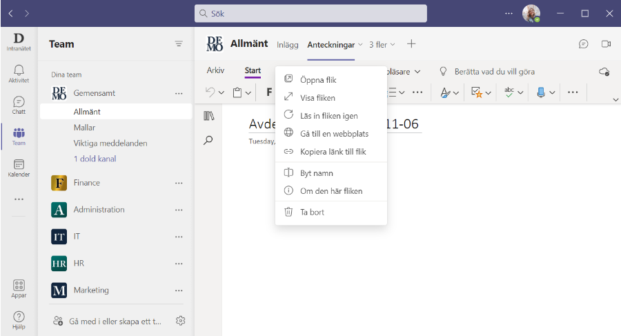 När du använder flikar i Teams kan du vilja ladda om fliken eller kopiera länk till fliken, dessa åtgärder har flyttats bort från rubrikfältet så att alla flikåtgärder är** samlade i flikmenyn**. Detta påverkar flikar i kanaler, chattar och möten.