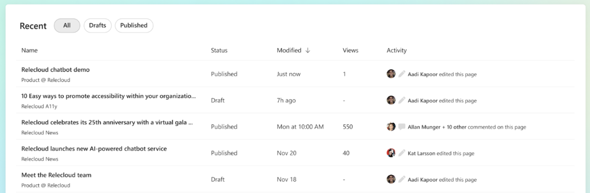Funktionen är under utveckling och heter Senaste sidor. Här får du en översikt över sidor du har skapat eller arbetat med, och nya möjligheter att skapa och spara utkast på din OneDrive – med full kontroll över publiceringen. Läs mer om hur denna funktion kan förenkla dina arbetsflöden och samtidigt ge dig bättre kontroll över ditt innehåll.