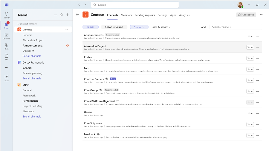 Gå direkt till fliken Kanaler för att se vilka kanaler det finns och hantera vilka du vill se i din lista. Bildkälla: Microsoft