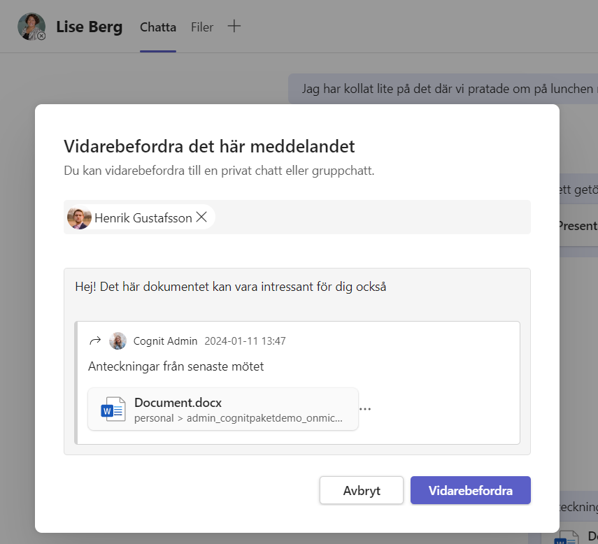 Välj “Vidarebefordra” så dyker det upp en dialogruta där du kan välja vilken chatt meddelandet ska kopieras in till (välj en pågående chatt eller starta en ny). Du kan också lägga till ett extra meddelande för att ge sammanhang åt det vidarebefordrade meddelandet.