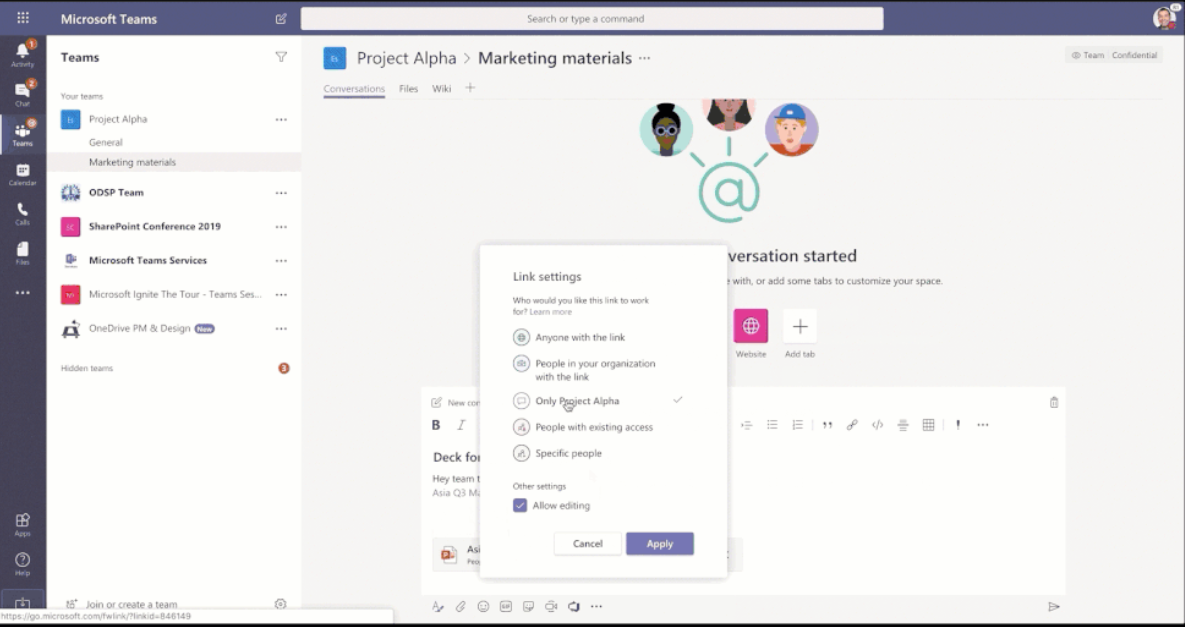Gör delningsinställningar när du delar en fil i en chatt eller en kanalkonversation i Teams. Bildkälla: Microsoft