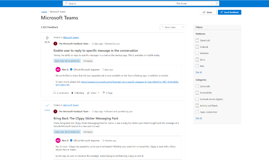 I slutet på oktober släppte Microsoft en förhandsversion av den nya feedback-portalen där du kan skicka in feedback och idéer som gäller Microsoft Teams och Microsoft Edge, bläddra bland andras inskickade idéer, läsa officiella Microsoft-svar, kommentera och rösta på idéer.