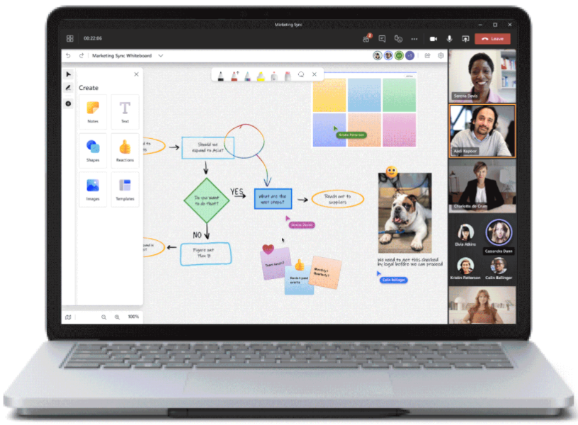 Microsoft Whiteboard i Teams har byggts om helt och innehåller nu mer än 40 nya anpassningsbara mallar, möjlighet att infoga bilder och former och 8 nya reaktioner. Du kan infoga bilder och dokument, exempelvis PowerPoint-presentationer, och arbeta med nya pennor och färger för att visualisera dina idéer. Nya Whiteboard är tillgänglig i Teams för desktop, webb och mobil.