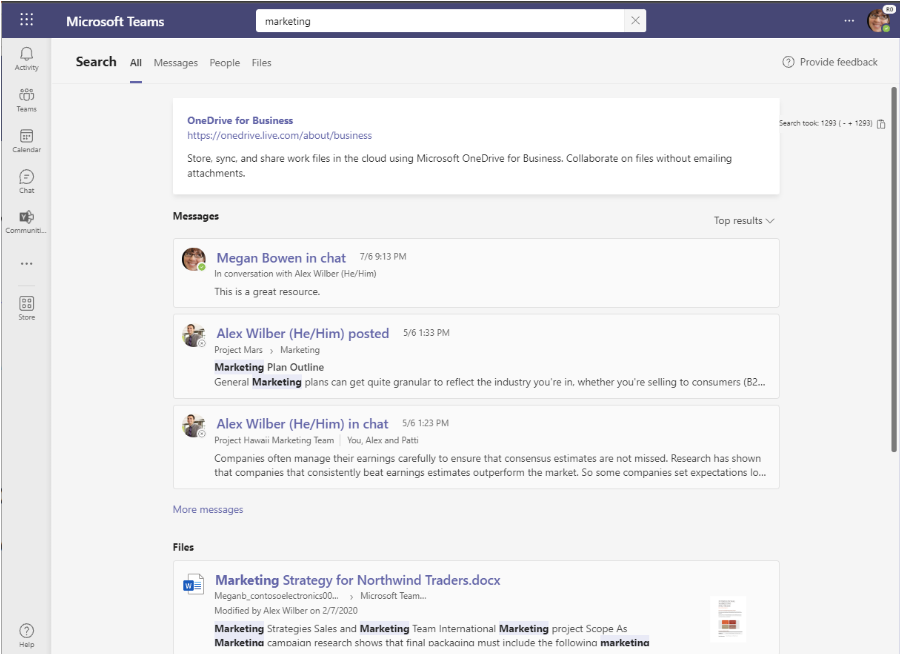 Teams skrivbords-app kommer få en ny sökresultatsida för att göra det snabbare och mer intuitivt att hitta meddelanden, personer, svar och filer. Den omarbetade sökresultatsidan har bättre sammanhang, snabbare resultat och förbättrade filtreringsmöjligheter med AI-driven relevans baserat på de personer och innehåll du interagerar mest med i Teams och andra Microsoft 365-tjänster. Uppdateringen håller på att rullas ut.