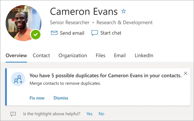 Har du råkat ut för att vissa av dina kontakter i Outlook finns med flera gånger? Nu kan du få hjälp med att hitta och slå samman dubblett-kontakterna i din adressbok direkt i personens profilkort (i Outlook på webben).