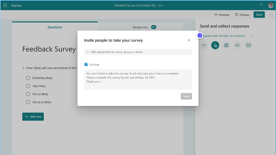 Skicka inbjudan direkt ifrån Forms. Bildkälla: Microsoft
