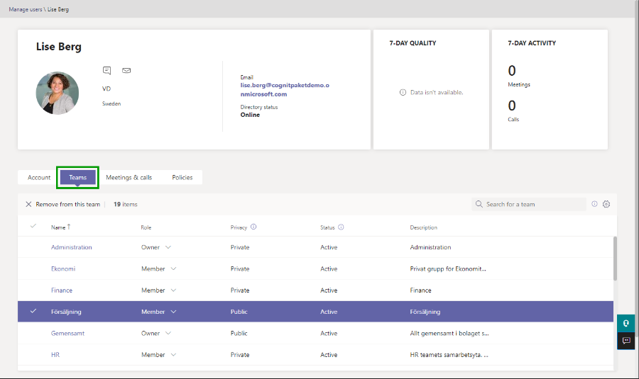 Det finns tillfällen då man behöver se över ägarskap och medlemskap i Teams, exempelvis om en användare ska gå på föräldraledighet eller avsluta sin anställning. Nu kan du som administratör enkelt få en överblick över vilka team den enskilda användaren är med i. Du ser också om personen är ägare eller medlem i teamet och kan göra ändringar direkt i admingränsnittet.