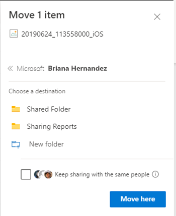 Om du har delat en fil och behöver flytta den, antingen från din OneDrive till SharePoint eller mellan olika SharePointsiter kommer du kunna välja att fortsätta dela filen även från det nya stället.