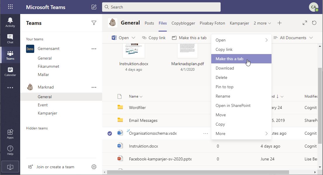 Nu kan du också enkelt lägga upp Visiodokumentet som en flik i Teams och göra så att alla i teamet snabbt hittar det viktiga organisationsschemat.