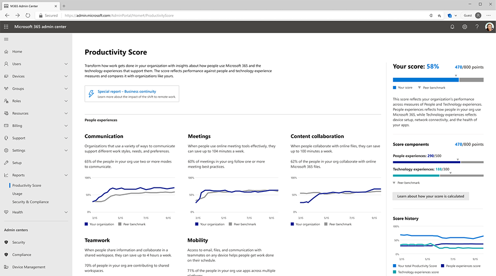 Den nya tjänsten Productivity Score används för att se** teknisk information om ditt nätverk** och även för att förstå hur medarbetarna samarbetar och använder funktioner som chattrum och schemaläggningsverktyg.