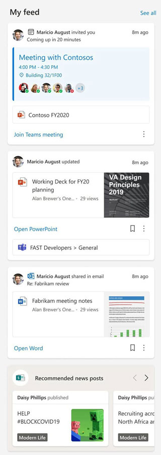 Det som visas kan vara möten du ska vara med på, dokument som lagras i en delad mapp i OneDrive, dokument som ligger på en SharePoint-webbplats eller länkar som någon skickat i en e-postkonversation.