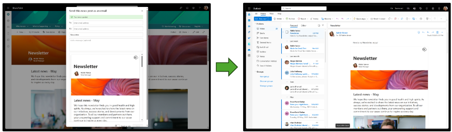 En spännande uppdatering för alla SharePoint-redaktörer: Nu kan du enkelt skapa och skicka kompletta nyhetsinlägg direkt till dina medarbetares e-post i på samma gång som du publicerar nyheten på intranätet. Skapar du dessutom nyheten på en Teamsite kan nyheten automatiskt bli ett inlägg i kanalen och därigenom ge maximal spridning.