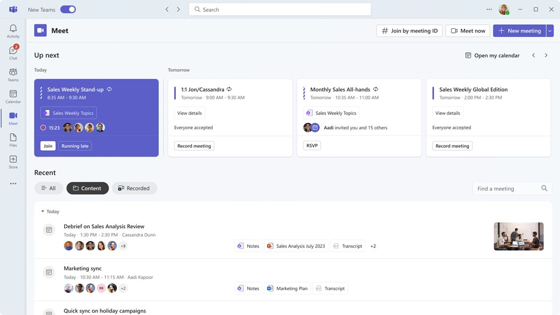 Möten, som den nya vyn kallas, samlar allt material från mötesinbjudningar, möteschattar och mötesinspelningar på ett ställe och gör det mycket enklare både att förbereda sig för ett kommande möte och att gå tillbaka och titta på inspelningar eller dokument från tidigare möten.