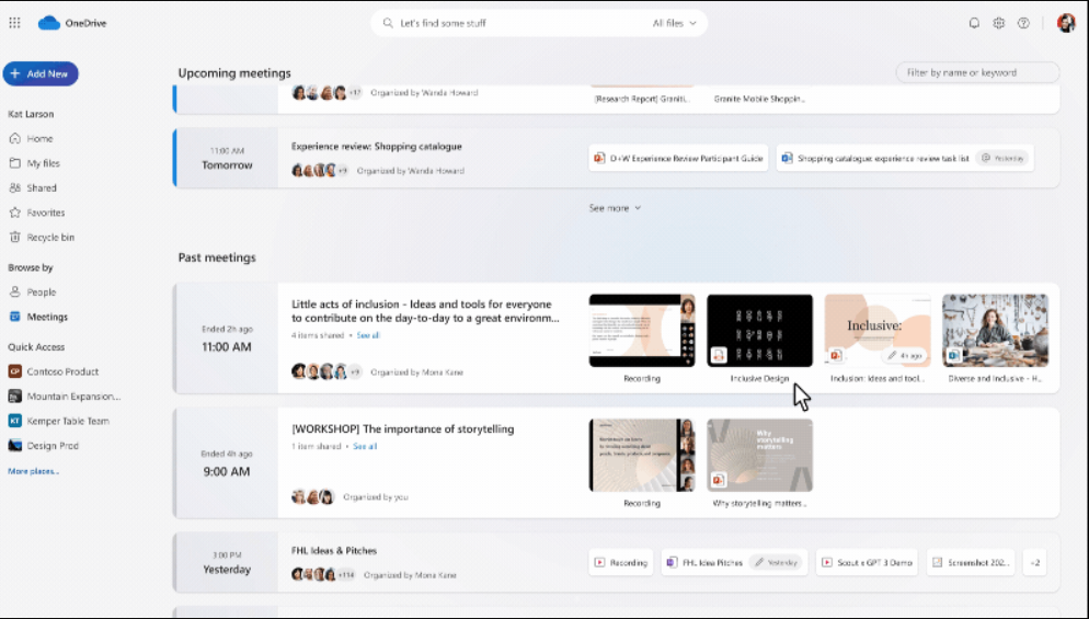 - Med den nya mötesvyn i OneDrive kan du hitta allt ditt mötesinnehåll snabbt och enkelt.