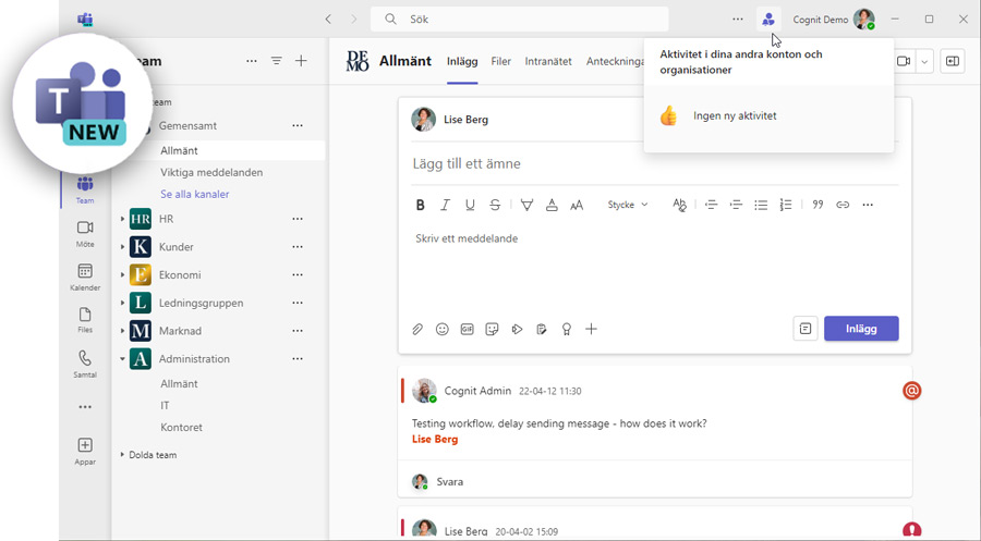 Nya Teams ger fler möjligheter att anpassa arbetsytan, bättre integration med olika Microsoft 365-appar och en förbättrad sökfunktion. En annan viktig nyhet är att du kan vara inloggad och aktiv i flera organisationer samtidigt.
