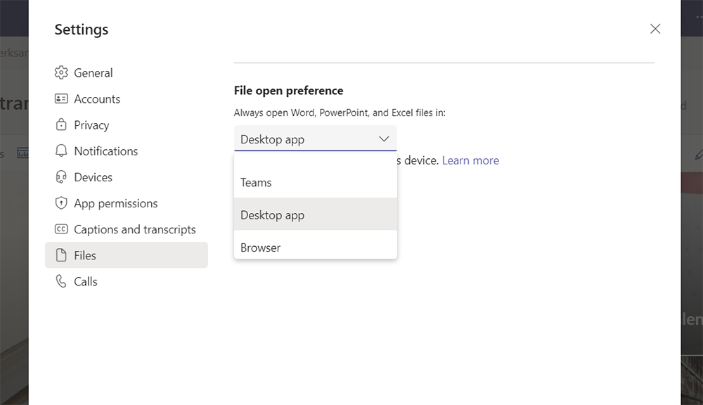 Trivs du bra med att filerna öppnas i Teams behöver du inte göra något alls men om du vill att filerna ska öppnas direkt i skrivbords- eller Online-appen kan du ändra standardinställningen i Teams. Inställningen gäller för Office-filer dvs att alla Word-, Excel- och PowerPoint-filer öppnas på samma sätt.