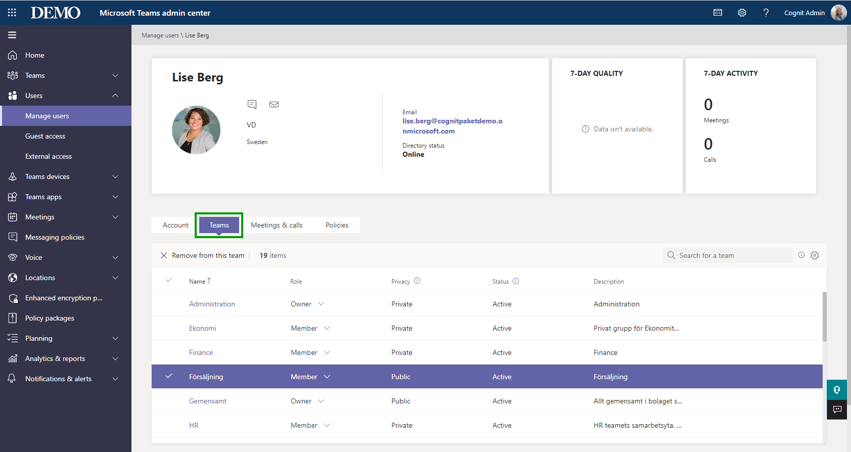 Nu kan du som administratör enkelt få en överblick över vilka team den enskilda användaren är med i och om personen är ägare till några team. Eftersom det är viktigt att det alltid finns minst en ägare till varje team kan ni behöva ordna så att någon annan tar över ägarskapet.