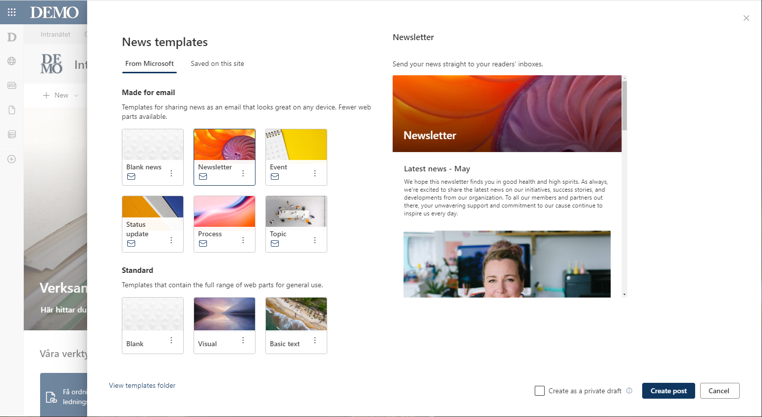 - Skapa ett nytt nyhetsinlägg och välj en “Skapa för e-post”-mall från mallväljaren