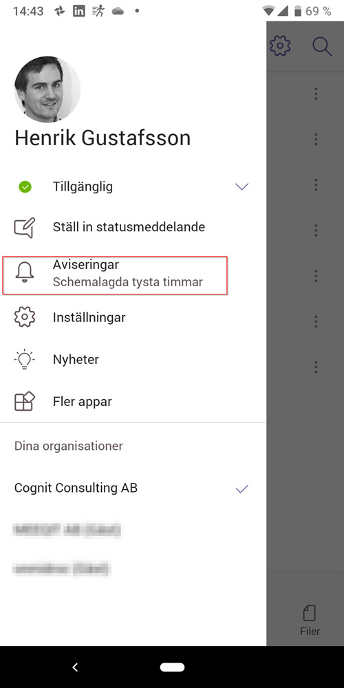Välj “Aviseringar” för att ställa in tysta timmar och tysta dagar