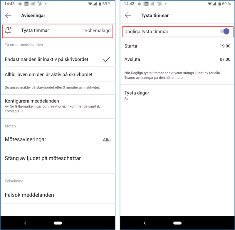 Välj Tysta timmar och välj vilka timmar som ska vara “tysta”