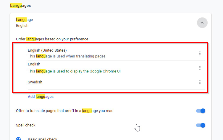 Men varför ser jag menyn på engelska? Jo för att nu råkar det vara så att jag trots att jag är svensk har satt att engelska ligger högre som språkpreferens i min webbläsare Google Chrome. Har du inte gjort några inställningar på den där ”magiska platsen” som ingen hittar, då blir det webbläsarens inställningar som styr.
