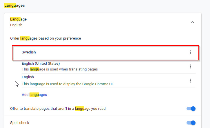 Engelska ligger högre som språkpreferens i webbläsarens inställningar
