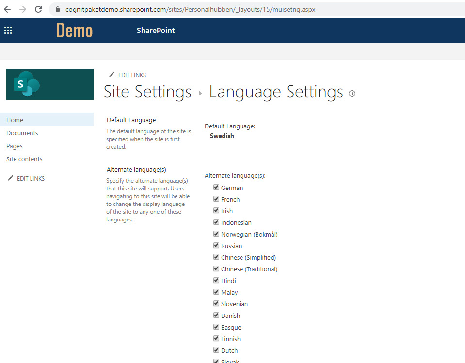 A) Grunden för flerspråksstöd är en inställning på webbplatssamlingen. Varje webbplats har ett standardspråk som du anger när du skapar webbplatssamlingen och som inte går att ändra i efterhand. Du kan sedan också välja att stödja ett eller flera tillgängliga språk men som vanligt så är det inte så enkelt att klura ut vad ett sådant val innebär för dig som användare och för din organisation.