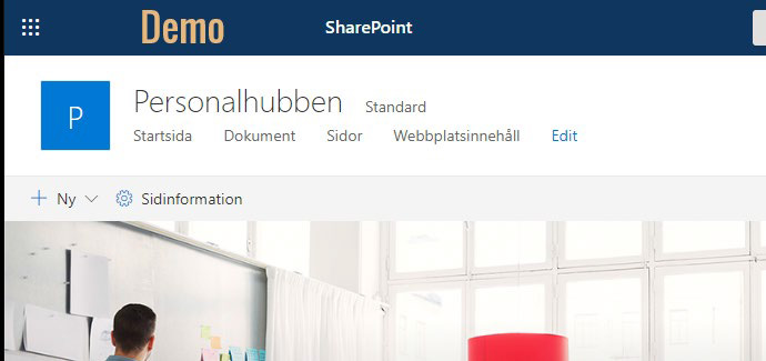 Du skapar en webbplatssamling som heter ”Personalhubben” som ligger på webbplatsen /sites/personalhubben och som har svenska som standardspråk.