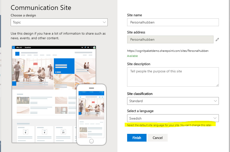 När du skapar en site i SharePoint (eller rättare sagt en webbplatssamling eller site collection på engelska – kärt barn har många namn…) så skulle jag säga att gemene man inte tänker så mycket på språkinställningen eller gör ett så aktivt val, det är mest något man klickar sig förbi.