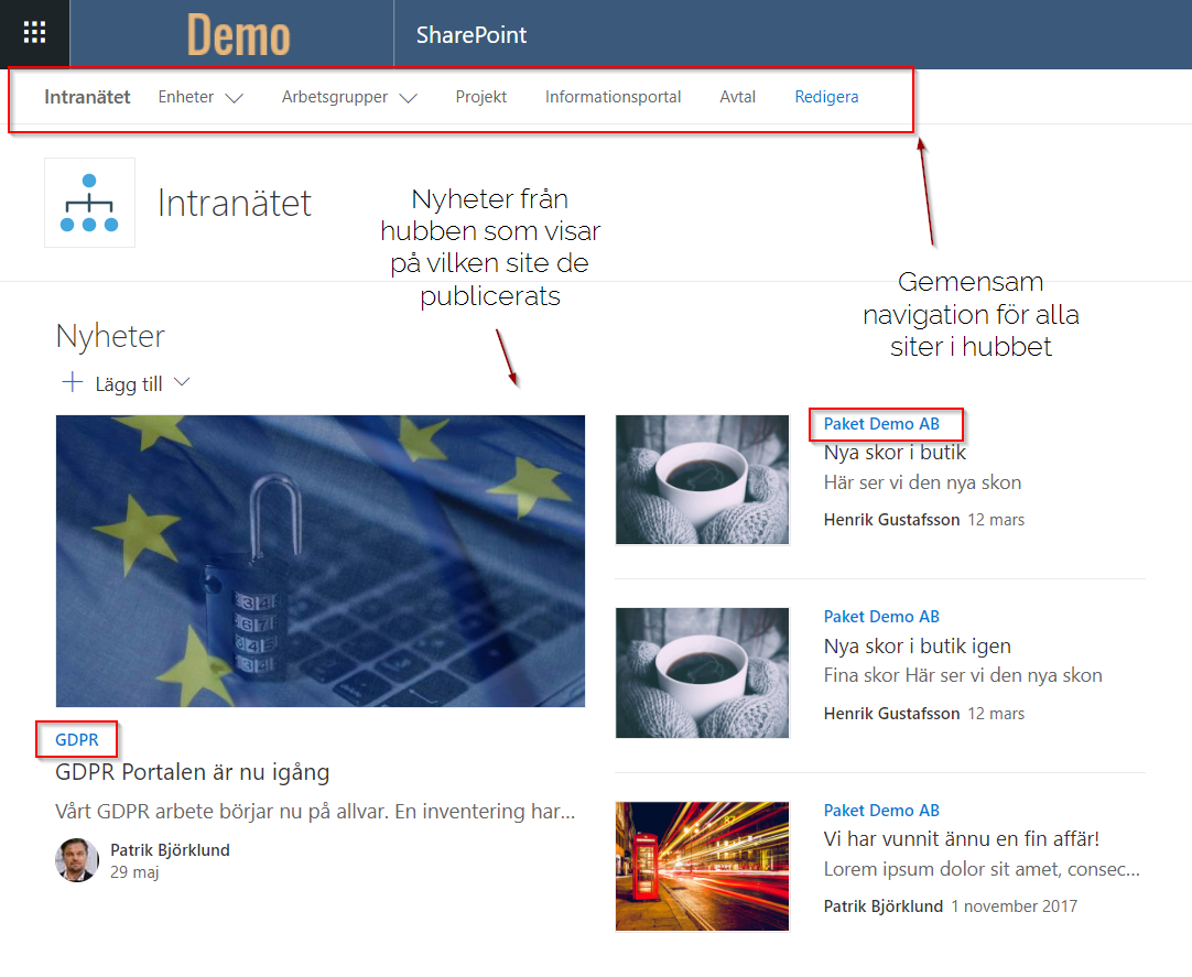 För att lyckas sy ihop den här platta arkitekturen och skapa kontexter lanserades nyligen “Hubsiter”. De är ett fantastiskt verktyg som hjälper dig att organisera och koppla samman siter med exempelvis gemensam navigation och branding oavsett vad de har för fysisk lagringsplats.