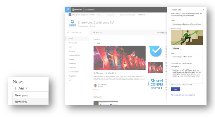 Microsoft har hört din klagan och nu skapat “News Links”. Dvs möjligheten att lägga till länkar från andra källor, som exempelvis er publika webb eller LinkedIn.