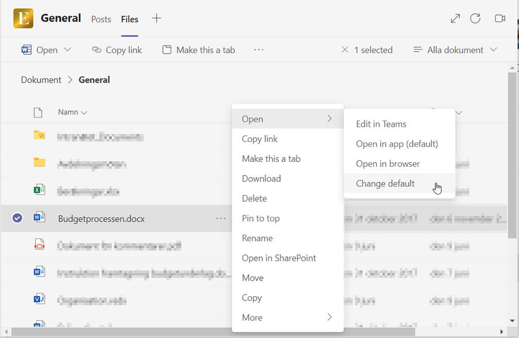 Du kan även komma åt den här inställningen från fliken Filer genom att markera ett dokument och klicka på ellipsen (de tre punkterna). Expanderar du Öppna-menyn (Open) finns alternativet Ändra standard (Change default).
